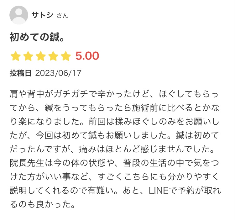 津市 男性『肩・背中のこり』施術例(揉みほぐし+鍼) 2024.04.27 お客様の声 エキテンよりいただいたお客様の声 津市 女性『肩こり・腰痛・足のむくみ』施術例(インディバボディー+揉みほぐし) 前の記事 鈴鹿市 男性『腰痛』施術例(揉みほぐし+鍼) 次の記事