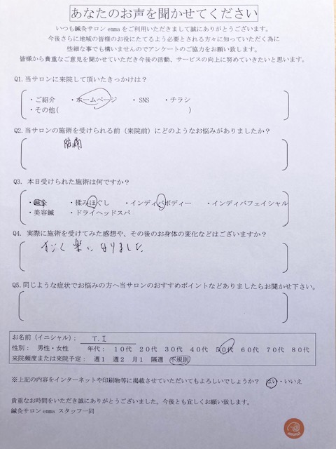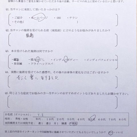 〇50代 〇男性 〇来院頻度:不規則 〇施術内容:鍼灸・揉みほぐし・インディバボディー